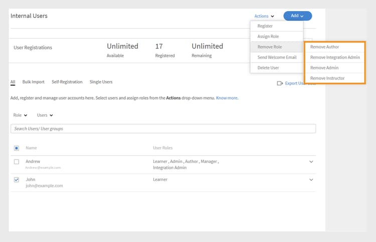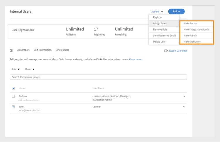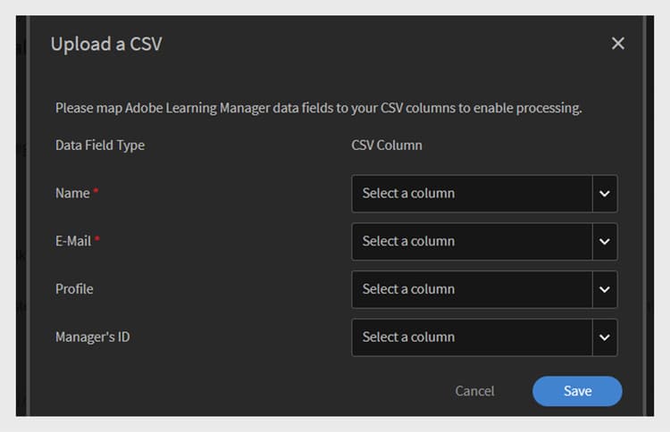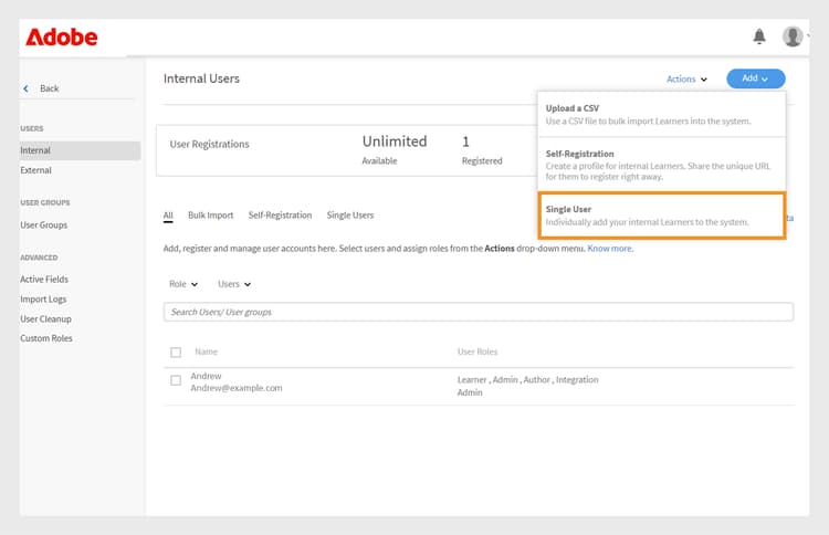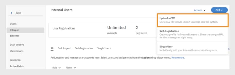 Adobe Learning Manager (ALM)可讓管理員使用各種方法(包括手動輸入、CSV上傳、自助註冊和系統整合),來建立和管理內部和外部使用者。