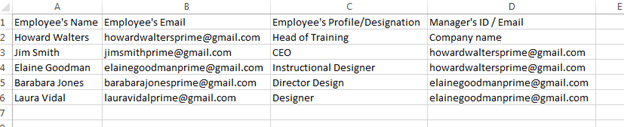 在為任何員工新增經理的電子郵件ID之前,請確保該經理已作為員工包含在CSV檔案中。 例如,在下方的快照中檢視名為Howard Walters的員工。