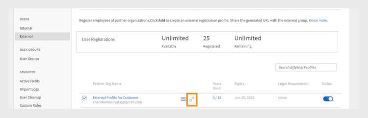 外部設定檔的註冊URL可以從 外部使用者 區段複製。