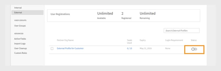 管理員可以在Adobe學習中追蹤新增到每個外部設定檔的使用者數量。