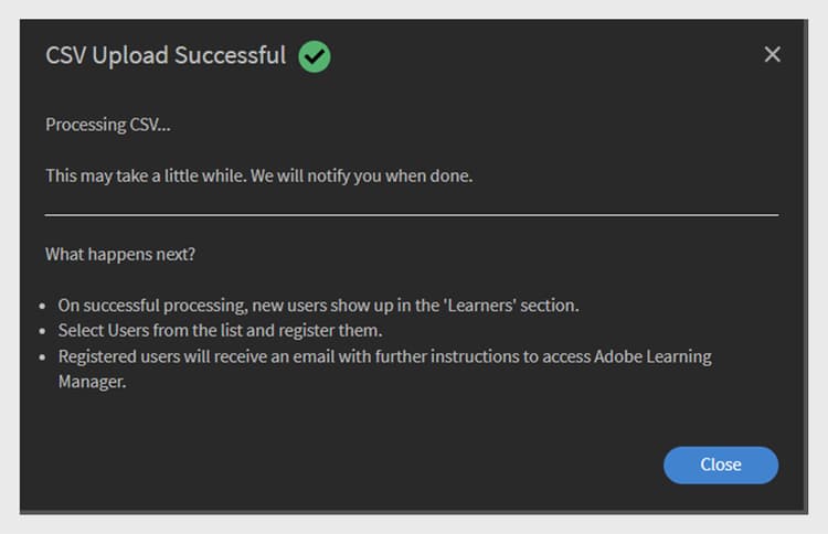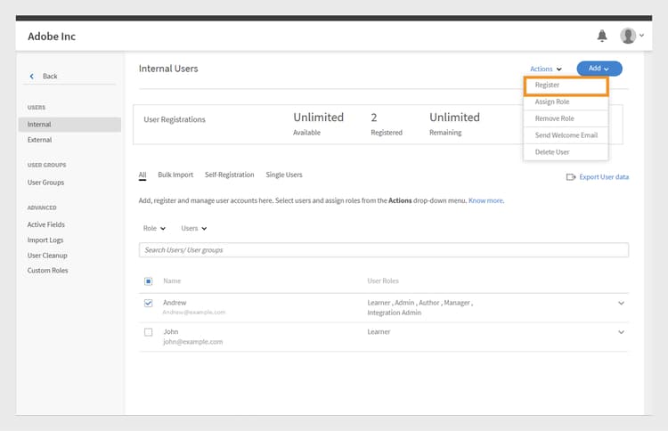 個別或大量新增使用者後,您需要註冊他們以啟動其帳戶。 這可讓使用者存取Adobe Learning Manager並開始使用平台。