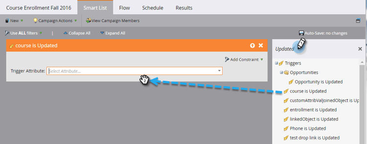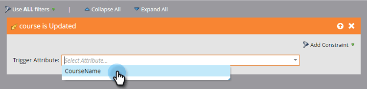 在智慧行銷活動的智慧清單中,當自訂物件新增到人員或公司時,您可以觸發流量動作。 您也可以建立使用自訂物件中的 變更 作為觸發器的智慧清單。 例如,當課程名稱更新時,可使用它來傳送電子郵件。