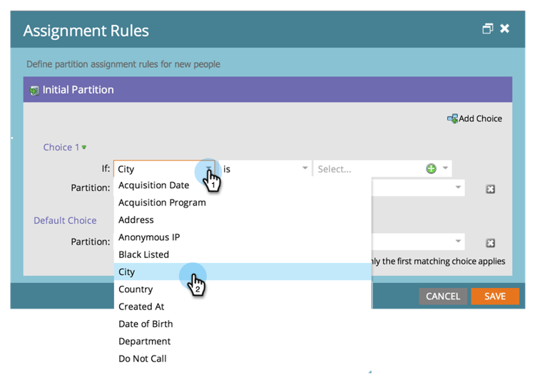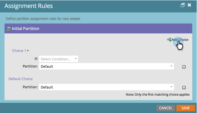 按一下 Add Choice 以新增將人員路由至人員分割的條件。