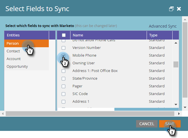 選取您要同步至Marketo的欄位,以便預先選取它們。 按一下「Save」。