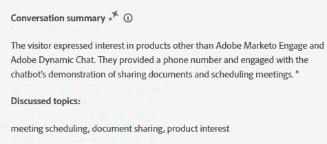交談摘要會即時為您產生快速摘要,包括訪客表示有興趣的主題。 它位於每個聊天畫面的右下角。