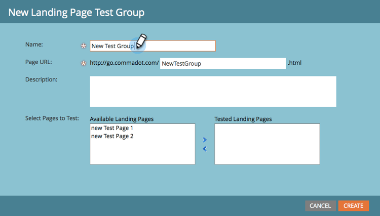 在[建立新登入頁面]對話方塊中,輸入新的測試群組 Name。