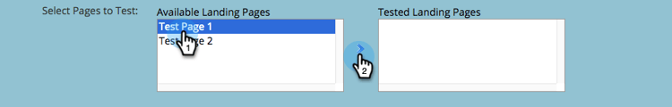 在對話方塊底部,選取 Available Landing Pages 清單中的複製頁面,然後按一下指向右側的箭頭,將其納入 Tested Landing Pages。 針對您要在此群組中的所有登入頁面執行此動作。