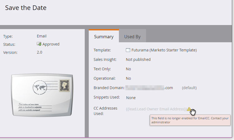 如果電子郵件已核准,但Marketo管理員在傳送電子郵件前停用一或多個「副本」欄位,這些人員將不會收到電子郵件。 在該案例中,「電子郵件摘要」檢視會將任何在核准後但預先傳送中停用的欄位變成灰色: