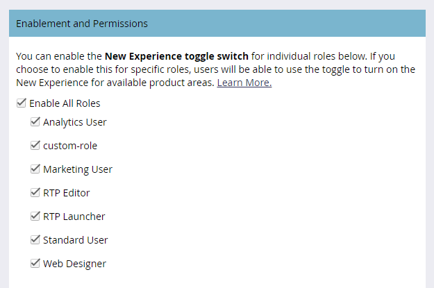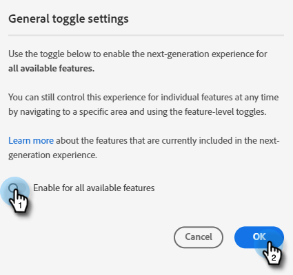 您可以選擇針對個別功能或者所有 (目前和即將推出的) 可用功能,手動啟用 Marketo Engage Modern UX。