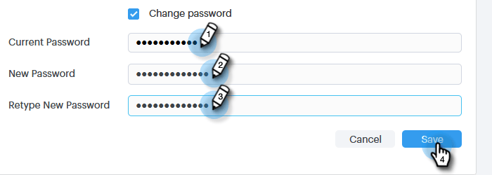 輸入您目前的密碼。 然後,輸入您的新密碼,然後重新輸入以確保它們相符。 完成時,按一下 Save。