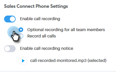 如果您想要讓賣家能夠自行啟用或停用通話錄製,請按一下Optional recording for all team members。 如果您要自動記錄所有通話,請按一下Record all calls。