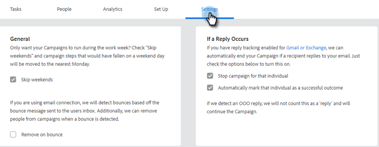 請務必造訪您促銷活動的 Settings標籤 來自訂排程和回複選項,例如略過週末(非常棒)。