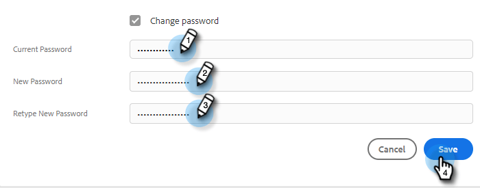 輸入您目前的密碼。 然後,輸入您的新密碼,然後重新輸入以確保它們相符。 完成時,按一下 Save。