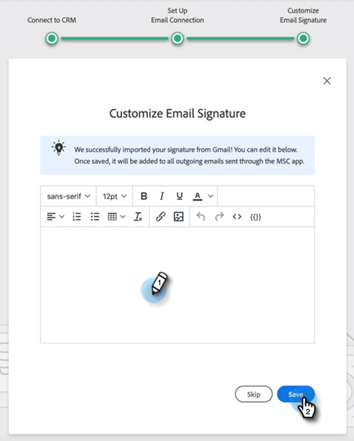 輸入您的自訂簽章,然後按一下 Save (如果您稍後要透過設定檔頁面執行此動作,請按一下 Skip)。