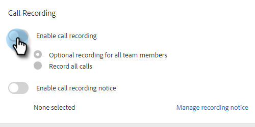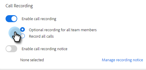 如果您想要讓賣家能夠自行啟用或停用通話錄製,請按一下Optional recording for all team members。 如果您要自動記錄所有通話,請按一下Record all calls。