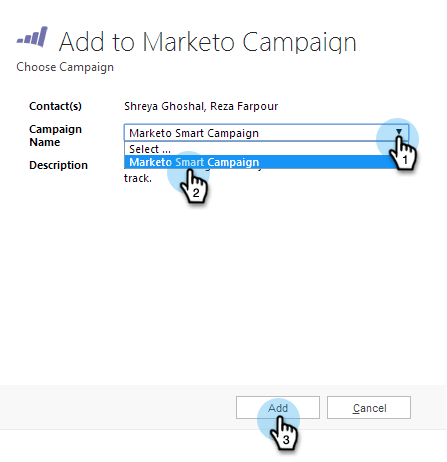 選取您要新增潛在客戶或連絡人的Marketo行銷活動,然後按一下 Add。
