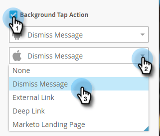 note note NOTE 如需背景的點選動作,您可以為Apple和Android平台設定不同的動作。 例如,Apple和Android的深層連結處理方式不同。 如果您的訊息只傳送到其中一個平台,請將另一個平台保留為預設設定,或選取 None。 若要完成工作,您的最後一步是設定[解除]按鈕。