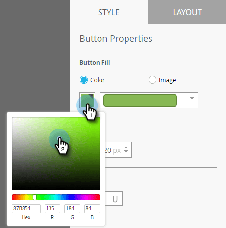 按一下顏色選取方塊,然後按一下按鈕顏色,或在檢色器上輸入十六進位或RGB數字來選取按鈕顏色。