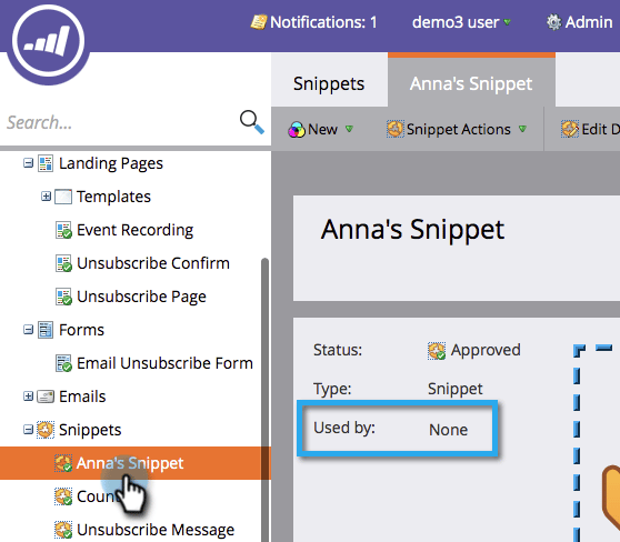 移至您的程式碼片段,並確定它不是 Used by 任何資產。