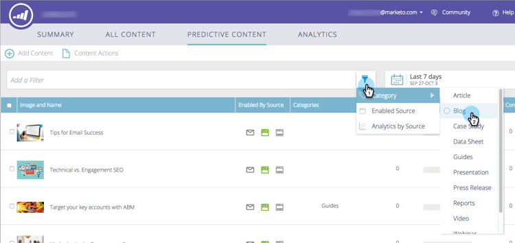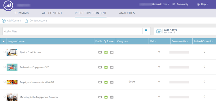 在您核准預測性內容的標題後,請在這裡處理它。 Predictive Content頁面會顯示您已核准用於預測性內容的所有標題。