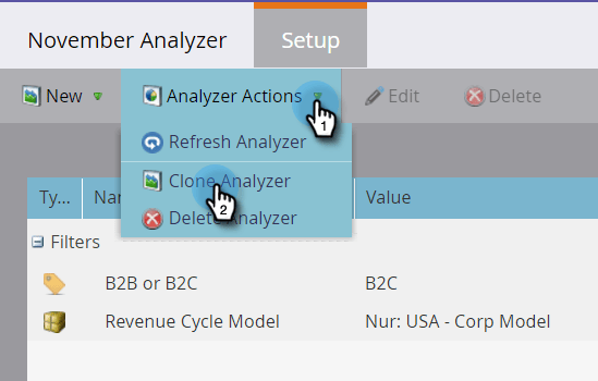 當您儲存的分析器開啟時,請開啟[分析器動作]下拉式清單,然後選取 Clone Analyzer。