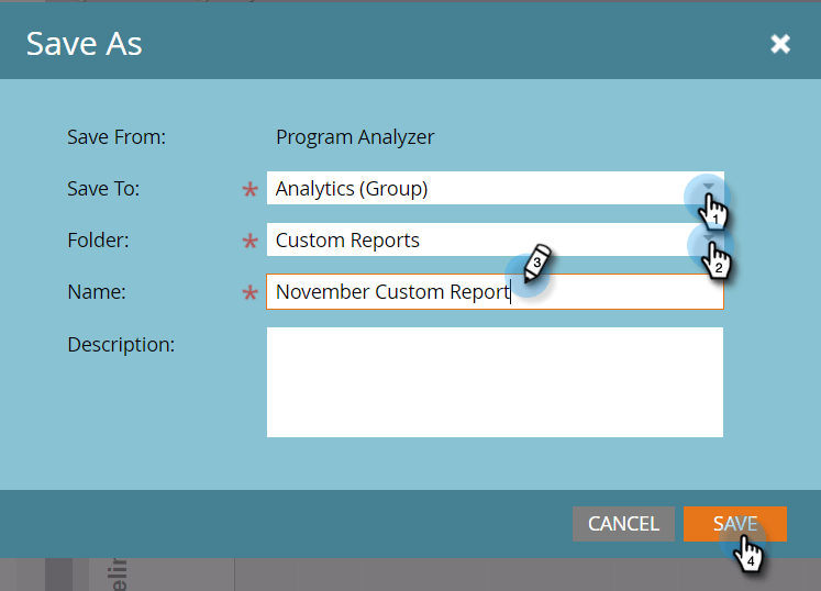 使用Save To和Folder下拉式清單,選取您要儲存自訂分析器的位置。 命名新的自訂分析器。 說明為選用。 按一下「Save」。