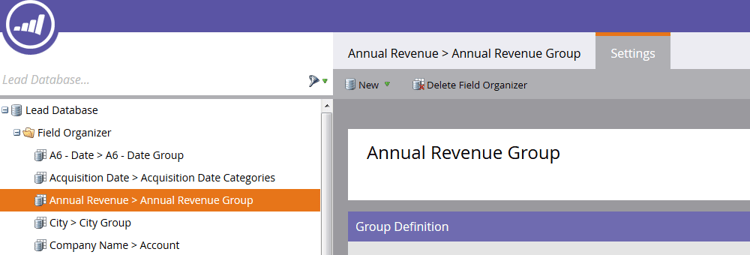 新的自訂群組會顯示在「潛在客戶資料庫」樹狀結構中,表示為「欄位名稱>欄位名稱群組」(範例:年度收入>年度收入群組)。