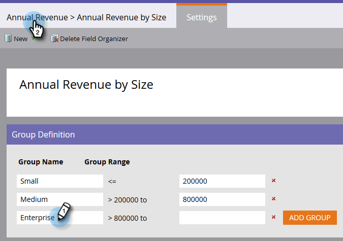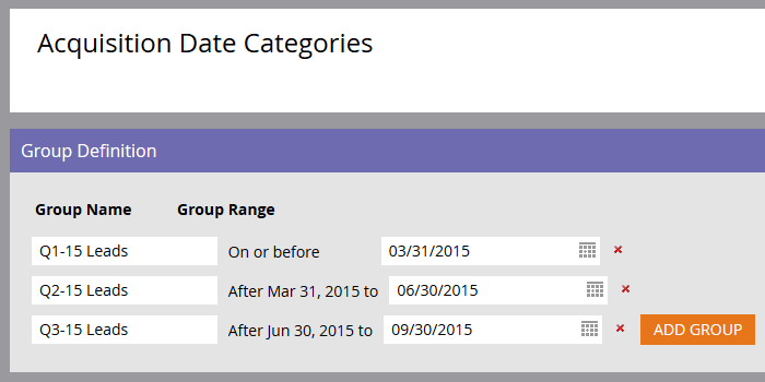 note note NOTE 您可以新增最多10個子群組來分類資料值。 每個Group Range專案都建立在上一個專案上。 如果您將您建立的最後一個自訂子群組的最後Group Range專案保留空白,則不會設定結束日期值。 以下範例顯示2015年第1季到第3季的銷售線索專案。