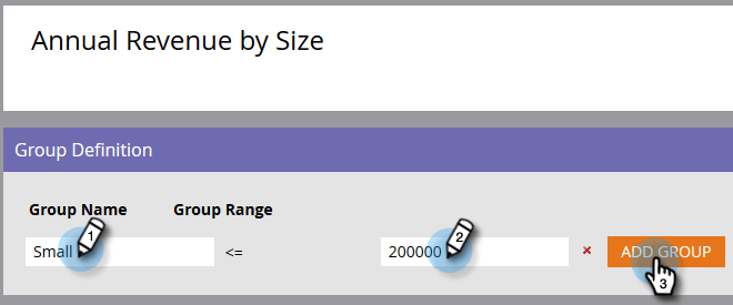按一下整數編輯器上方的預設自訂群組名稱,以自訂名稱。 例如,您可以將「年度收入群組」重新命名為「依大小的年度收入」。 按一下「Save」。