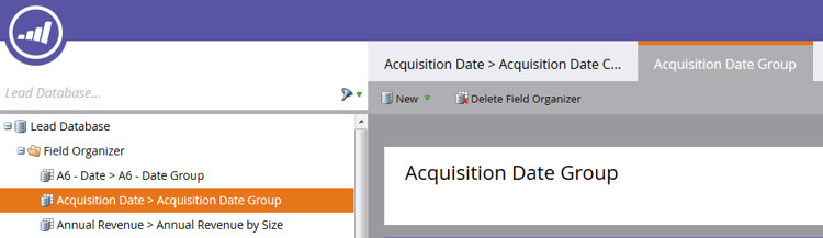 新的自訂群組會顯示在「潛在客戶資料庫」樹狀結構中,表示為「欄位名稱>欄位名稱群組」(範例:贏取日期>贏取日期群組)。