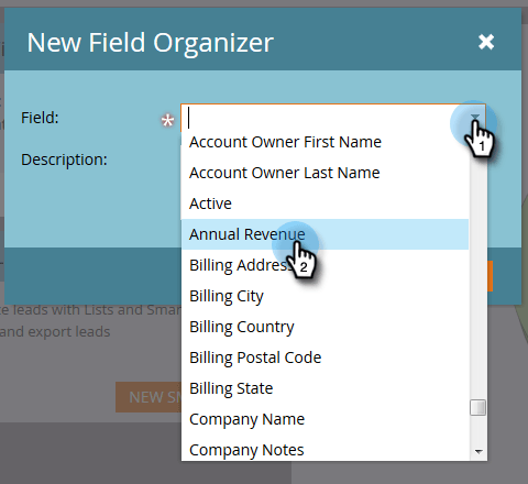 按一下 Field 並選取資料型別對應到字串編輯器的標準或自訂欄位(請參閱上一節中的表格)。 此處使用Annual Revenue。