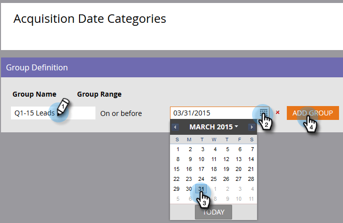 若要新增您的第一個群組,請在 Group Name 欄位中輸入名稱(例如:Q1-15銷售機會),然後在日期欄位中輸入日期,該日期代表取得銷售機會的日期或之前的日期(例如:Q1-15最後一天的日期:3/31/2015)。 按一下「Add Group」。