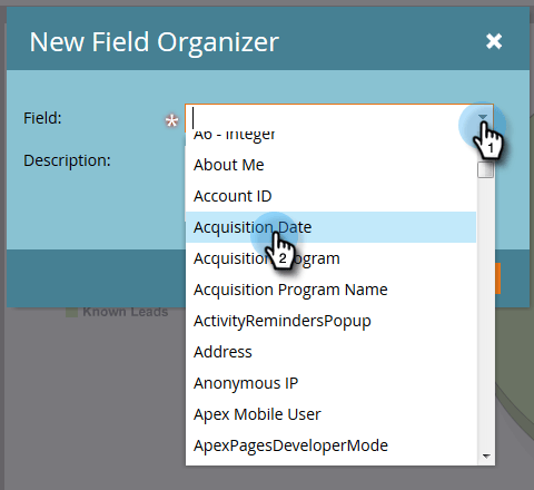 按一下 Field 並選取資料型別對應到字串編輯器的標準或自訂欄位(請參閱上一節中的表格)。 此處使用Acquisition Date。