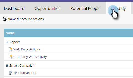 此標籤顯示哪些智慧行銷活動、網頁行銷活動、智慧清單或報表目前參考特定具名帳戶或帳戶清單。