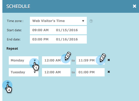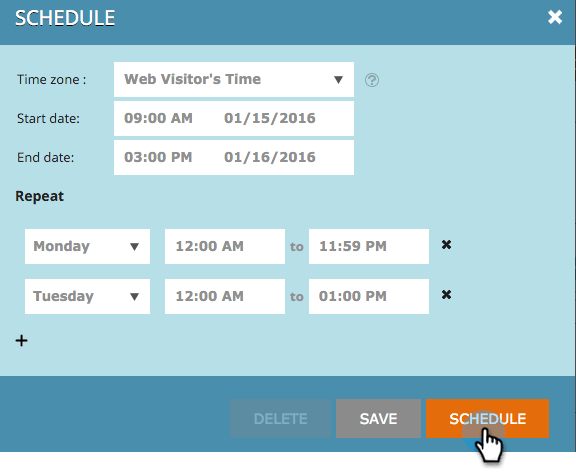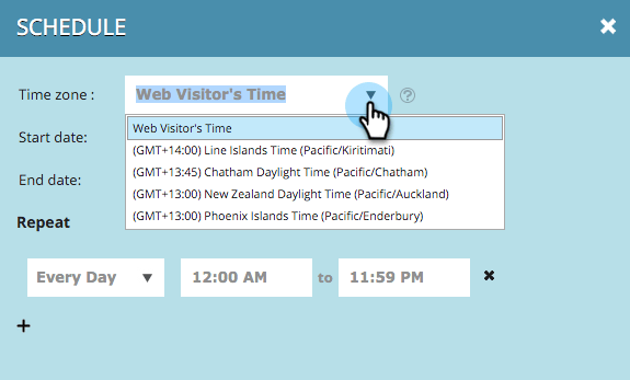 您可以根據網站訪客的時間或選取的時區來排程網站行銷活動。