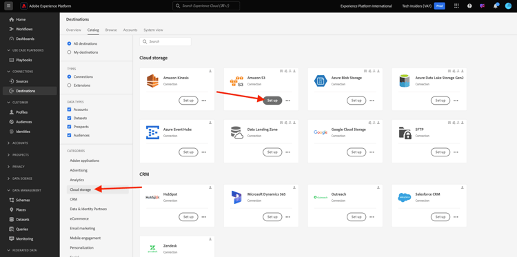 按一下 雲端儲存空間,然後按一下 Amazon S3 卡片上的 設定 按鈕(或 啟用對象,視您的環境而定)。
