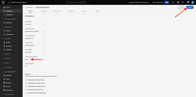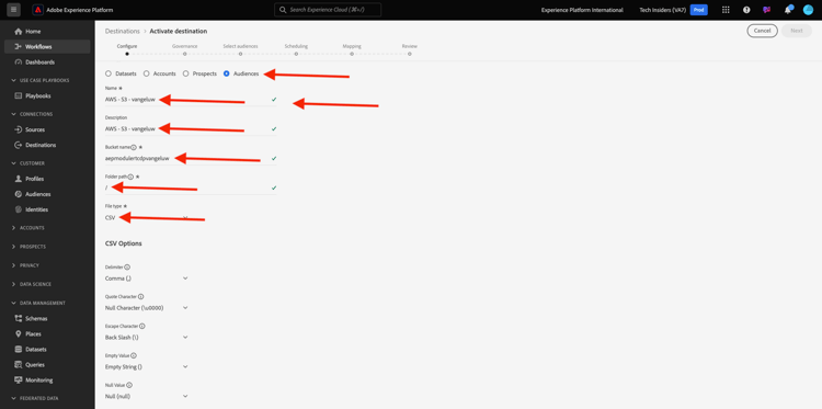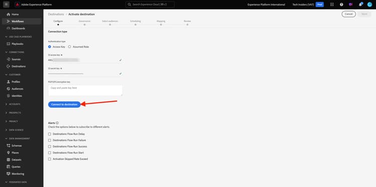 您可以使用FTP或SFTP作為每個電子郵件行銷目的地的專用目的地的一部分,或者您可以使用AWS S3在Adobe Experience Platform和這些電子郵件行銷目的地之間交換客戶清單。