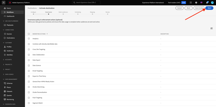 您現在可以選擇將資料控管原則附加至新目的地。 按一下 下一步。