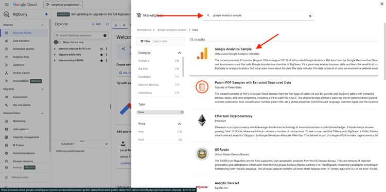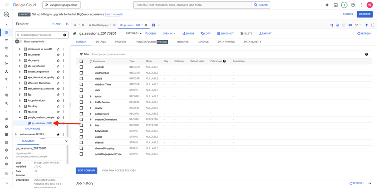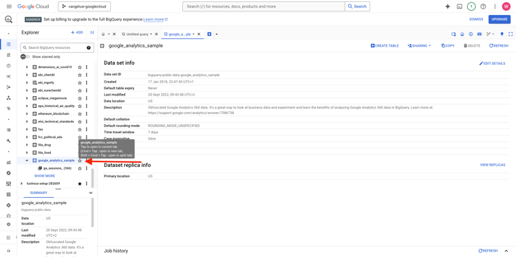 在 Explorer 中,您現在應該會看到一些表格。 歡迎探索這些內容。 移至google_analytics_sample