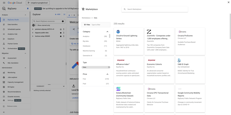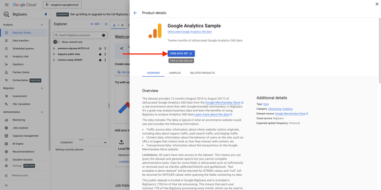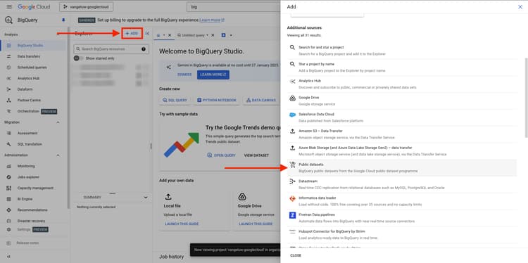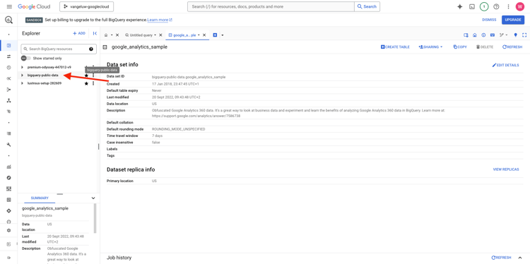 接著,系統會將您重新導向至BigQuery,您會在 總管 下看到此 bigquery-public-data 資料集。