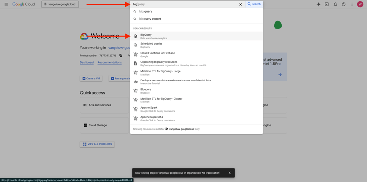 接著,移至熒幕上方的搜尋列,並輸入 BigQuery。 選取第一個結果。