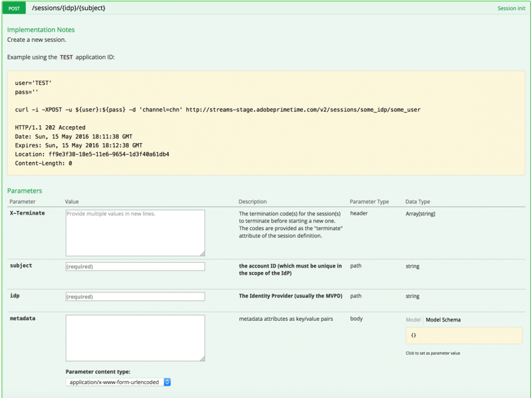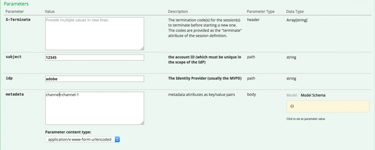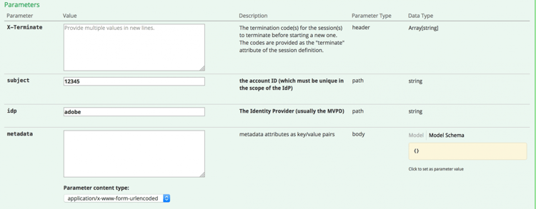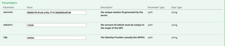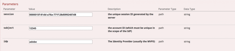 此 主旨 和 idp 引數是必要的,將會指定為URI路徑變數。 您可以取得 主旨 和 idp 引數,方法是呼叫 mvpd 和 上游使用者ID Adobe Primetime驗證的中繼資料欄位。 另請參閱 中繼資料API概觀. 在此範例中,我們會提供「12345」值作為主旨,以及「adobe」值作為idp。