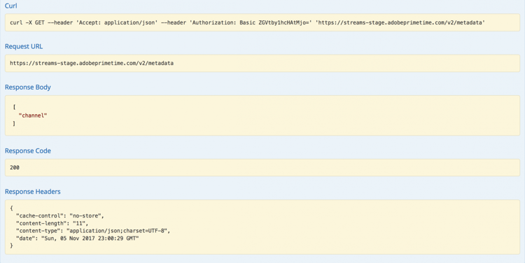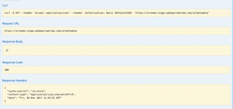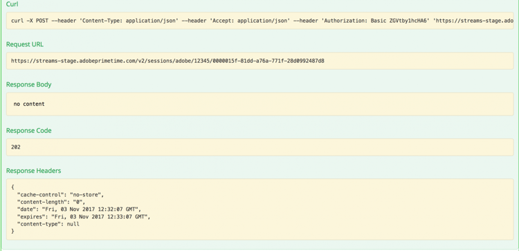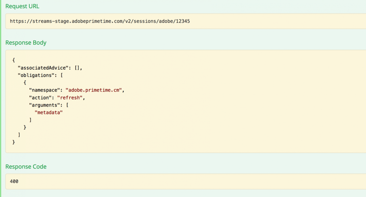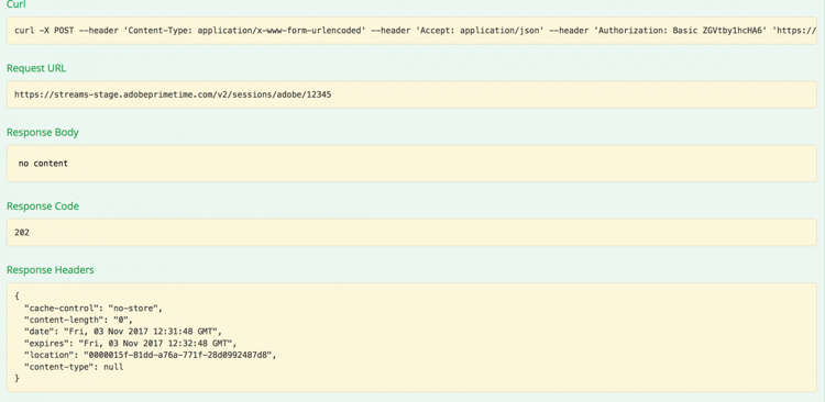 我們從回應本文欄位中看到,中繼資料屬性清單是空的。 這表示設計所需的屬性足以評估指派給此應用程式的3個串流原則。 另請參閱 標準中繼資料欄位檔案. 進行此呼叫後,我們可以繼續並在「工作階段」REST資源上建立新的工作階段。