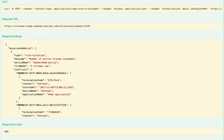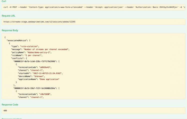 應用程式可使用評估結果中的資訊,在停止視訊時向使用者顯示特定訊息,並在需要時採取進一步的動作。 一個使用案例是停止其他現有的串流,以啟動新的串流。 這是透過使用 終止代碼 值存在於 衝突 特定衝突屬性的欄位。 此值將在新工作階段初始化的呼叫中作為X-Terminate HTTP標頭提供。