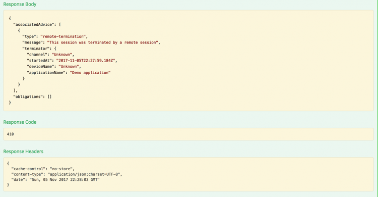 在工作階段初始化時提供一或多個終止代碼時,呼叫將會成功,並產生新的工作階段。 然後,如果我們嘗試對其中一個已從遠端停止的工作階段發出心率,我們會收到410 GONE回應,其中包含說明工作階段已從遠端終止的評估結果裝載,例如範例中的: