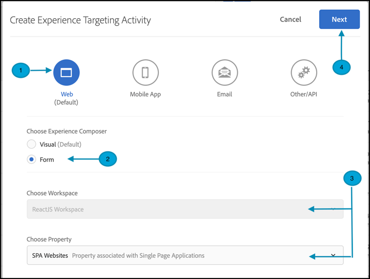 在 Create Experience Targeting Activity 強制回應視窗中,保留預設的 Web 選項為已選取(1)、選取 Form 作為您的體驗撰寫器(2)、選取工作區和屬性(3),然後按一下 Next (4)。
