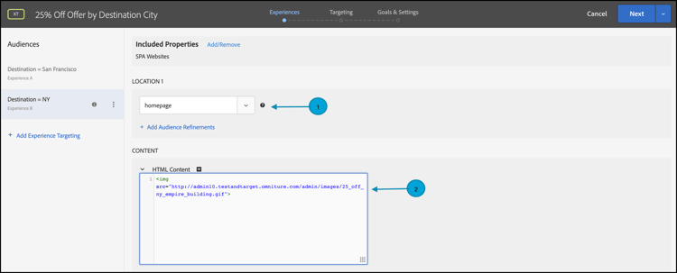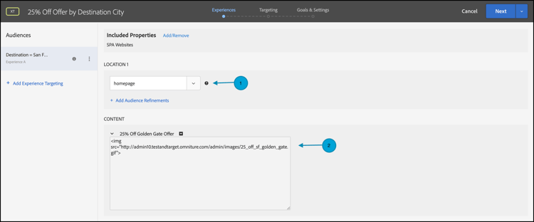 仍然在 Experiences 步驟中,輸入您的應用程式中要呈現有關Golden Gate Bridge之特殊優惠方案的位置(1)名稱,但僅限於前往舊金山的訪客。 在此範例中,首頁是為HTML選件(2)選取的位置,此位置已在 Content 區域中定義。