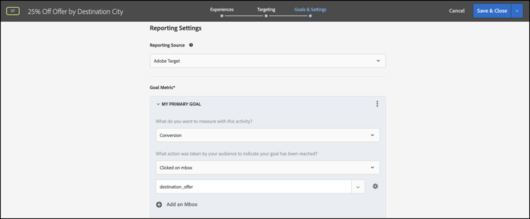 在 Goals & Settings 步驟中,選擇 Adobe Target 作為 Reporting Source,以便在Adobe Target UI中檢視活動結果,或選擇 Adobe Analytics,以便在Adobe Analytics UI中檢視這些結果。