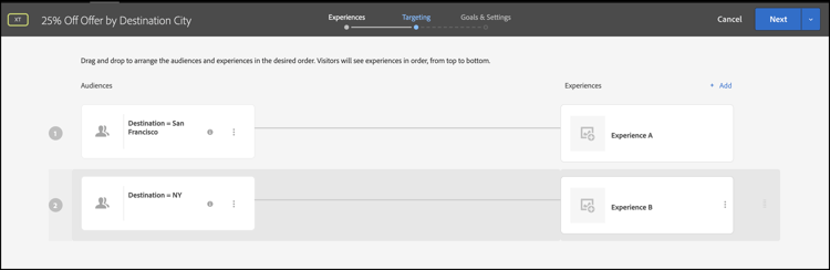 在 Targeting 步驟中,確認您已設定每個對象所需的個人化體驗。