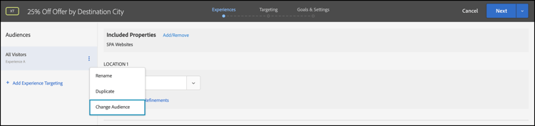 按一下 Add Experience Targeting 以新增其他目標對象。 這次,藉由定義